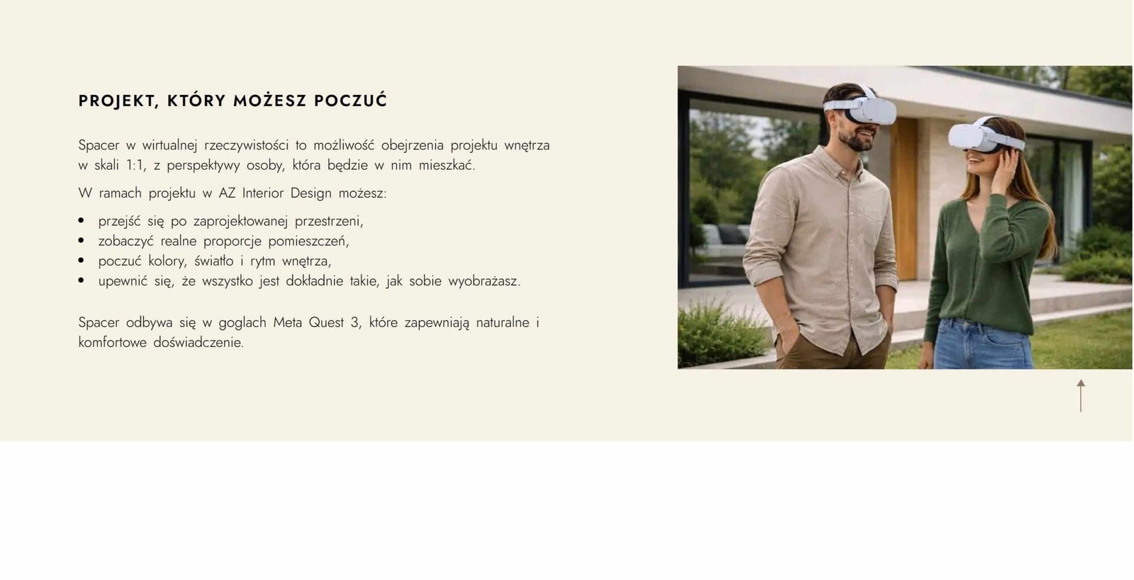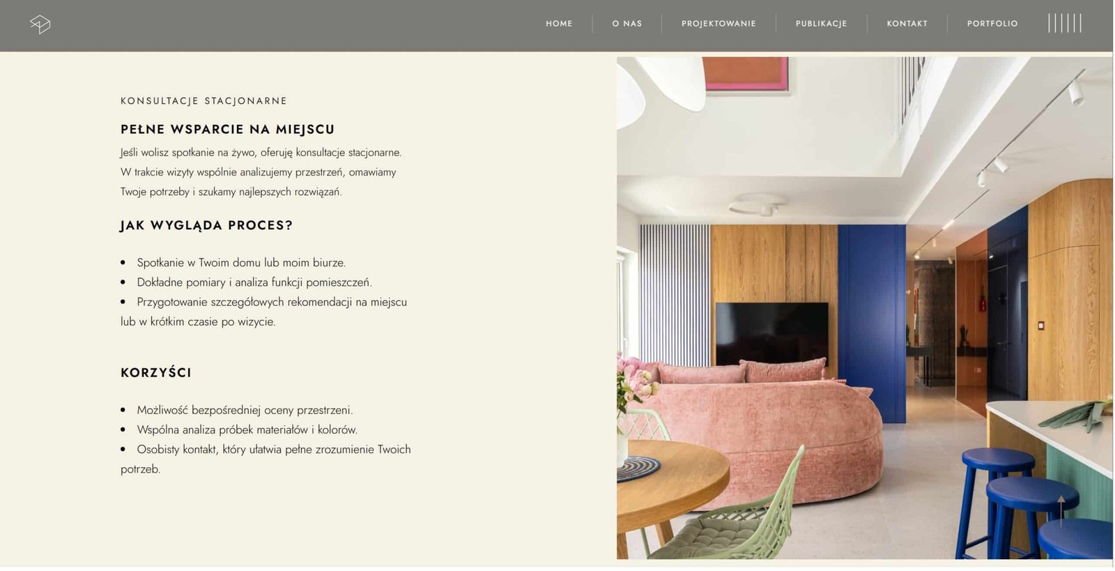 Strona została zaprojektowana z myślą o intuicyjnej nawigacji – użytkownicy w prosty sposób mogą przeglądać portfolio projektów wnętrz, zapoznać się z ofertą projektowania wnętrz, poznać proces współpracy oraz szybko skontaktować się w sprawie realizacji projektu. Całość jest w pełni responsywna i zoptymalizowana pod kątem wydajności, co gwarantuje płynne działanie na komputerach, tabletach i smartfonach.