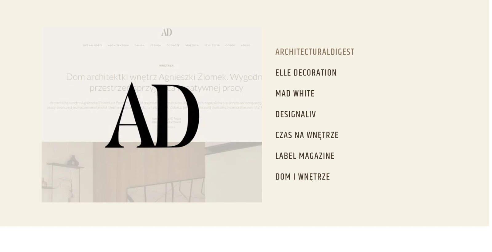Celem projektu było zaprojektowanie strony internetowej dla projektanta wnętrz, która odzwierciedla charakter marki osobistej, buduje zaufanie klientów i w atrakcyjny sposób prezentuje realizacje wnętrz – od mieszkań i domów, po przestrzenie komercyjne. Minimalistyczny układ, uporządkowana struktura oraz subtelna estetyka sprawiają, że projekty wnętrz są w centrum uwagi. Starannie dobrana typografia, spójna kolorystyka i wysoka jakość zdjęć podkreślają profesjonalizm i indywidualne podejście Agnieszki Ziomek do każdego projektu.