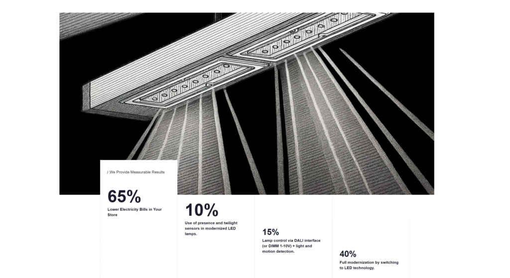 Witryna prezentuje wszystkie usługi firmy – od audytów i projektowania oświetlenia, przez instalację, aż po serwis – w sposób intuicyjny i atrakcyjny wizualnie, tak aby odwiedzający mogli szybko odnaleźć informacje i nawiązać kontakt. Zadbaliśmy o czytelny układ, nowoczesny design i integrację multimediów, dzięki czemu strona angażuje użytkowników i wzmacnia komunikację z klientami oraz partnerami biznesowymi.